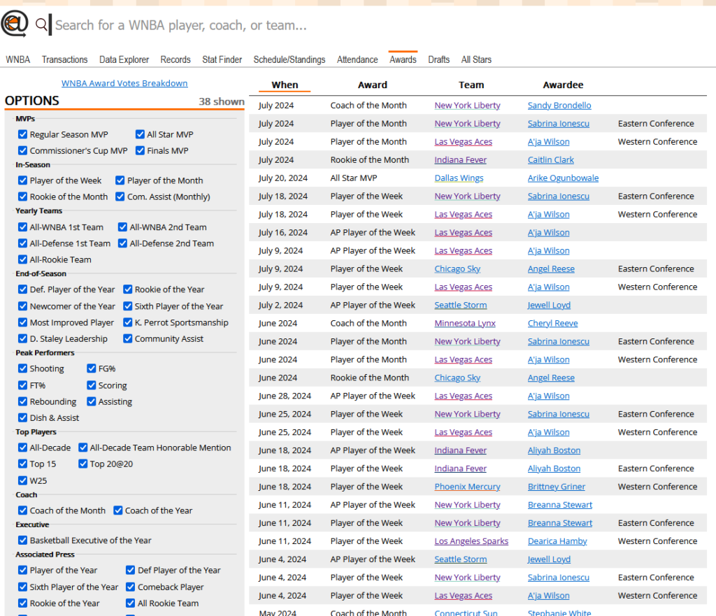 The site was created in 2018 by Maitreyi Anantharaman with the goal of providing “a space dedicated to the history of women’s basketball.” [1] Across the Timeline helps fans and supporters understand the history of the league and how it has progressed through the years. Data on attendance, trades, schedules, and awards are specifically chosen to chronicle the history of the WNBA, which is the goal of the site. Across the Timeline contains data often associated with professional sports leagues, with the exception of finances and viewership numbers. In an academic journal written by Donald Staffo, he posits that women’s sports are more purpose-driven due to the disparity in finances and attention compared to their male counterparts. [2] With this in mind, one can argue that data like awards and trades are more relevant in maintaining a purpose-driven narrative of a woman’s professional sports league like the WNBA.