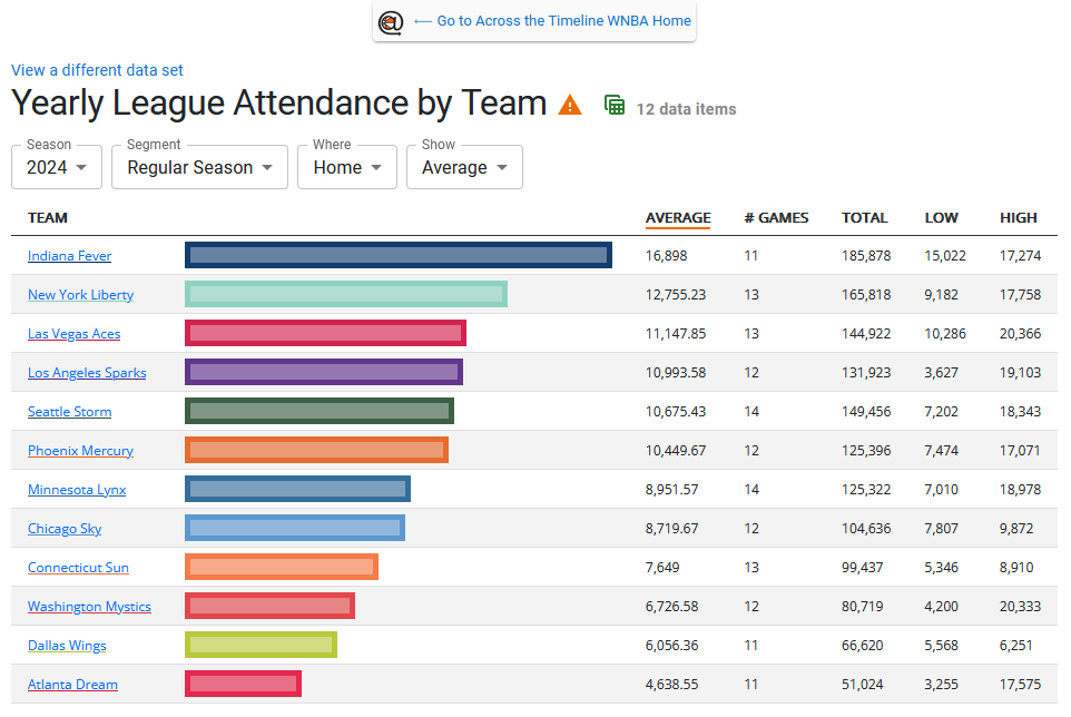 Another important form of information that the dataset lacks is a comparison to other leagues such as the NBA. Without this data, people who view the timeline lack context on the numbers they are viewing. For example, they may think the attendance numbers for WNBA games are extremely high until they are able to compare them to the NBA.